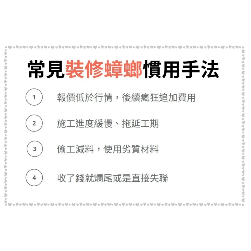 「裝修蟑螂」是指室內裝修⾏業中,詐騙客⼾、⾮誠信交易的業者。 他們通常會以低價吸引消費者簽約,接著話術誘騙、巧利名⽬追加款項,使⽤劣質材料,或延遲⼯期,最終可能惡意結束⼯程、⼈間蒸發。